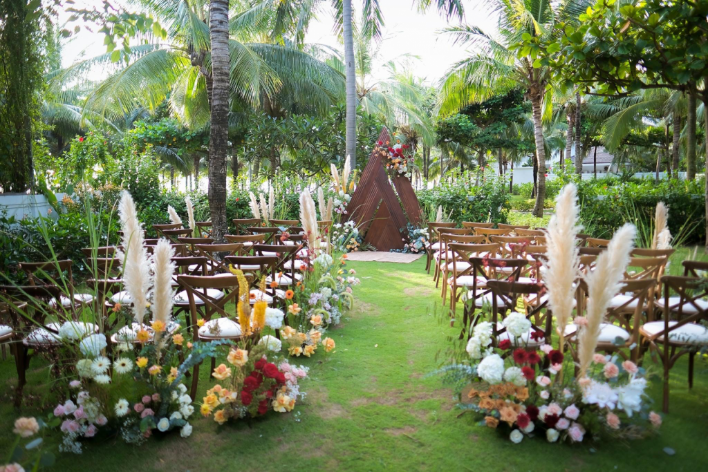 In the lush garden of Premier Village Da Nang Resort, an intimate and private wedding takes place under the soft glow of the setting sun, creating a memorable moment for the couple. The open space, filled with greenery, combined with elegant decorations, transforms the ceremony into a dignified and emotional occasion. Notably, the beachfront villas, located near the garden area, also offer a wonderful accommodation choice, allowing the couple and guests to enjoy romantic moments before and after the wedding.